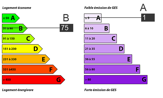 Performance énergétique : DPE : Classe B (consommation énergétique), GES : Classe A (émissions de gaz à effet de serre)